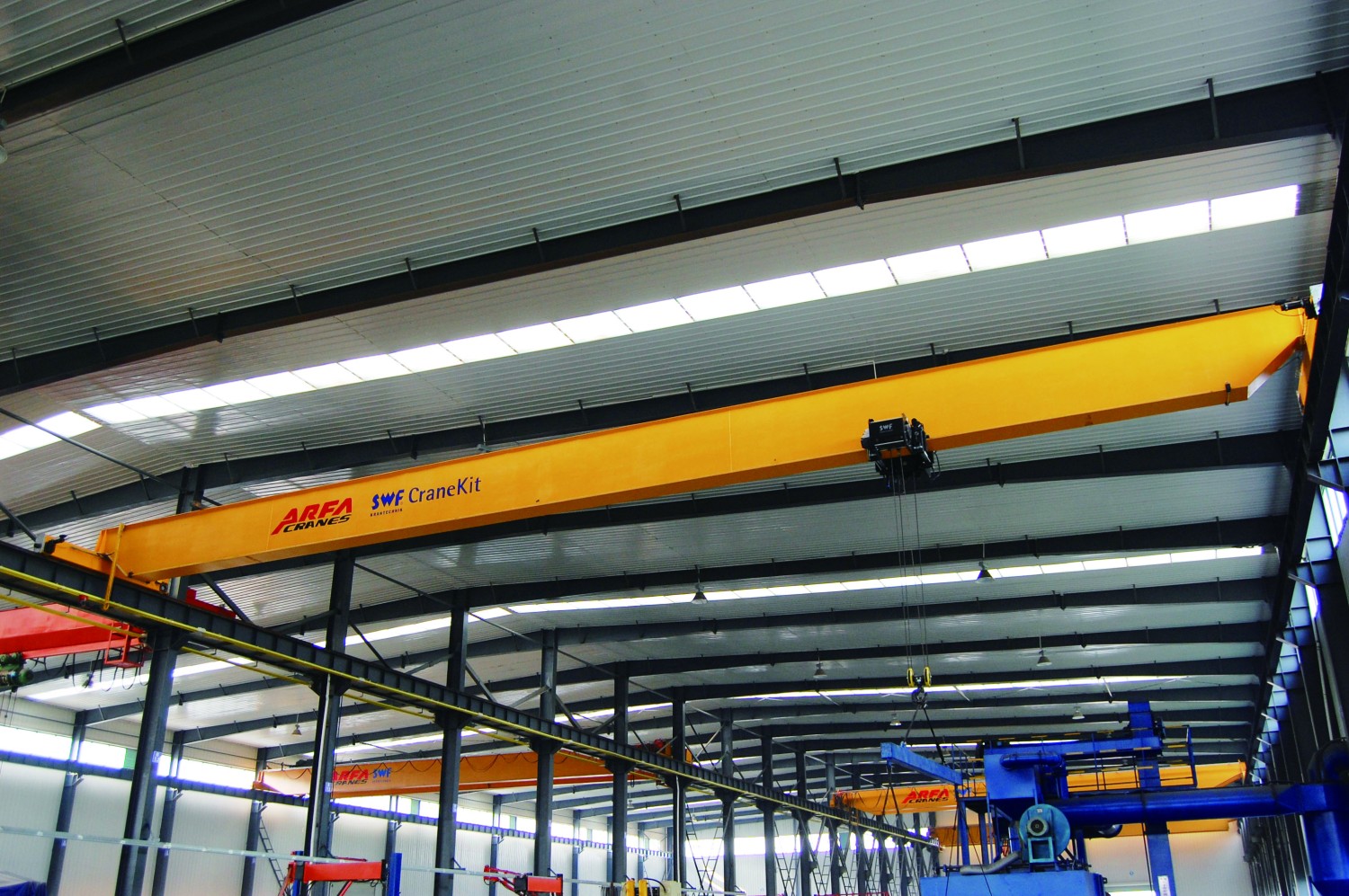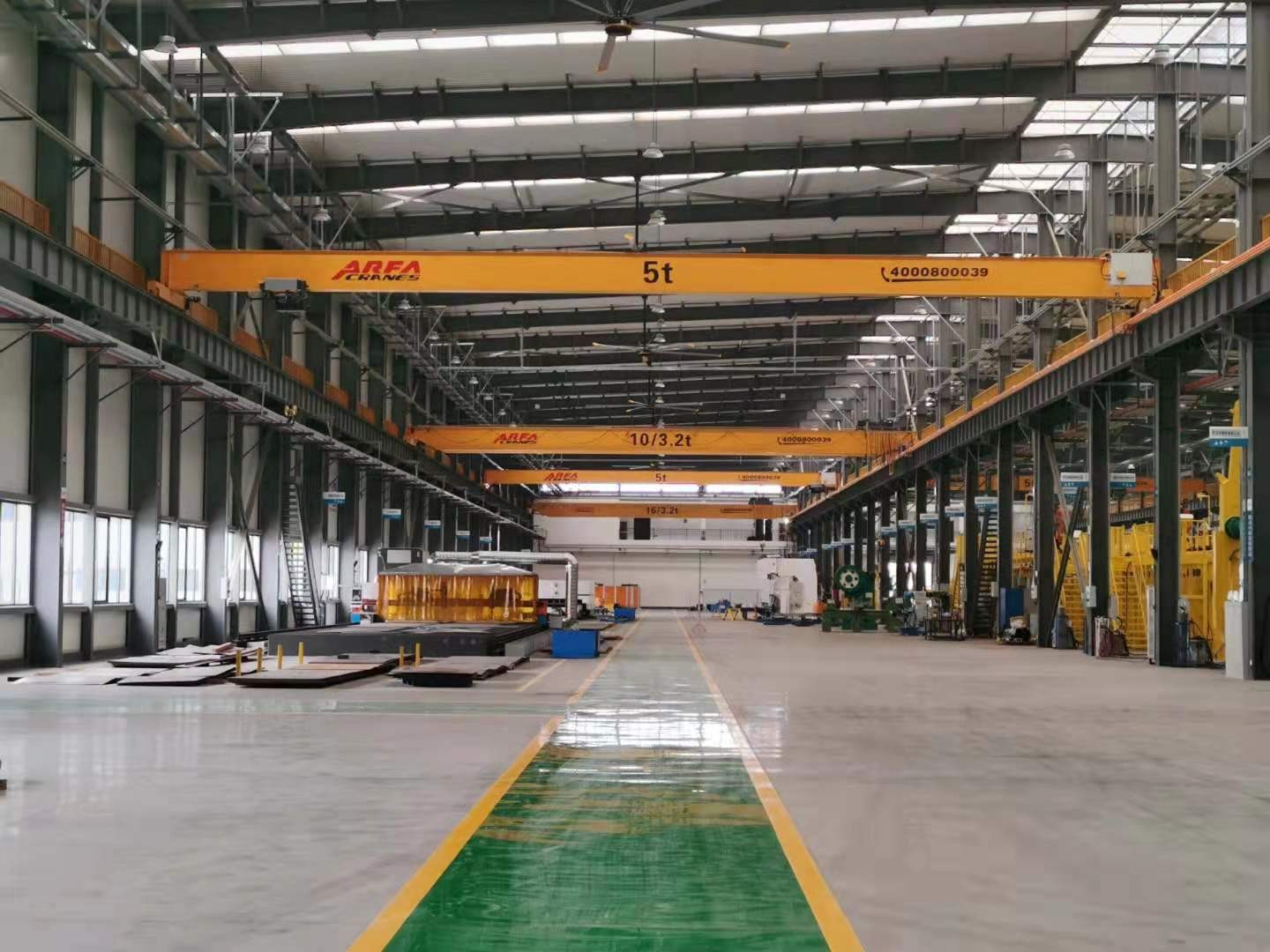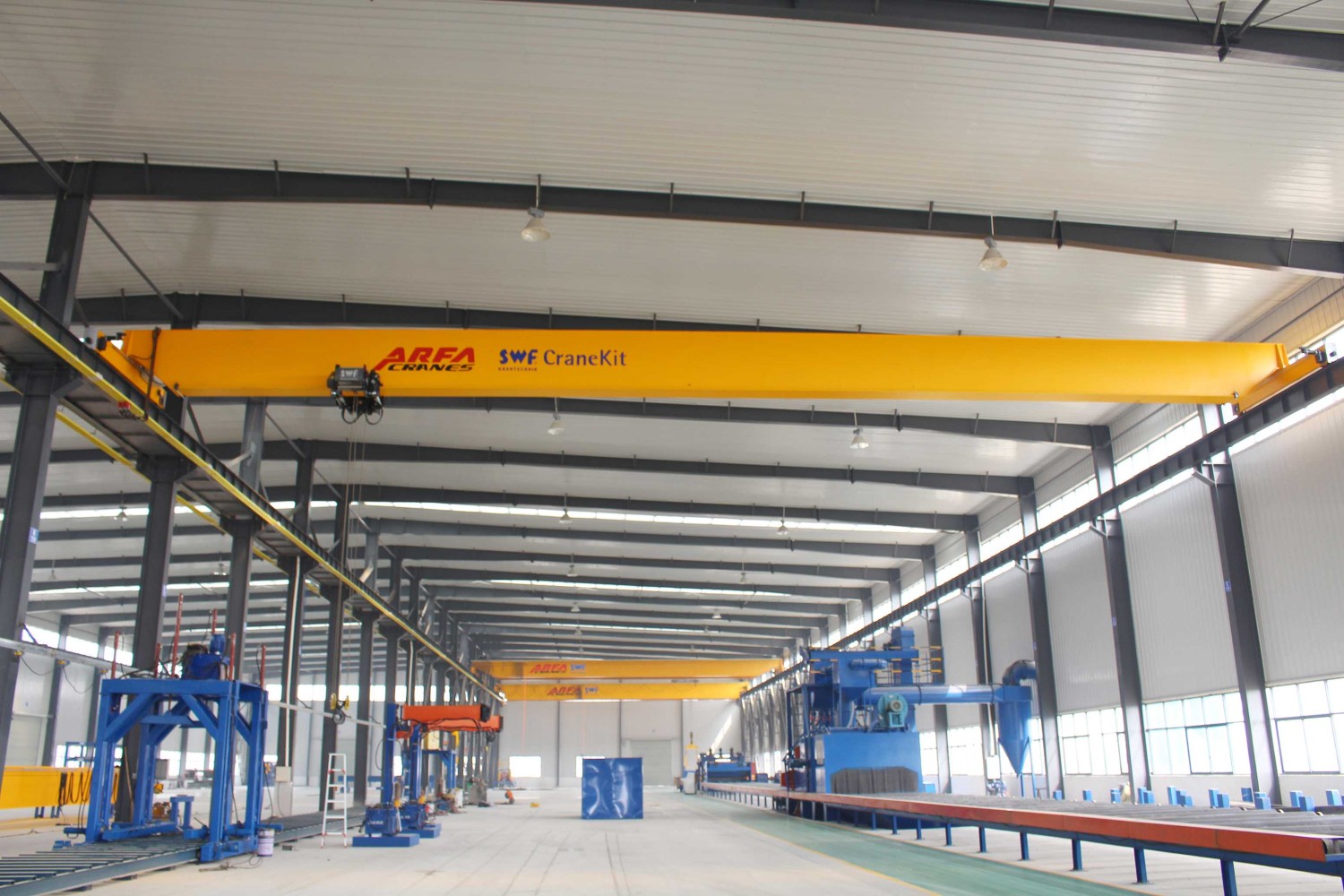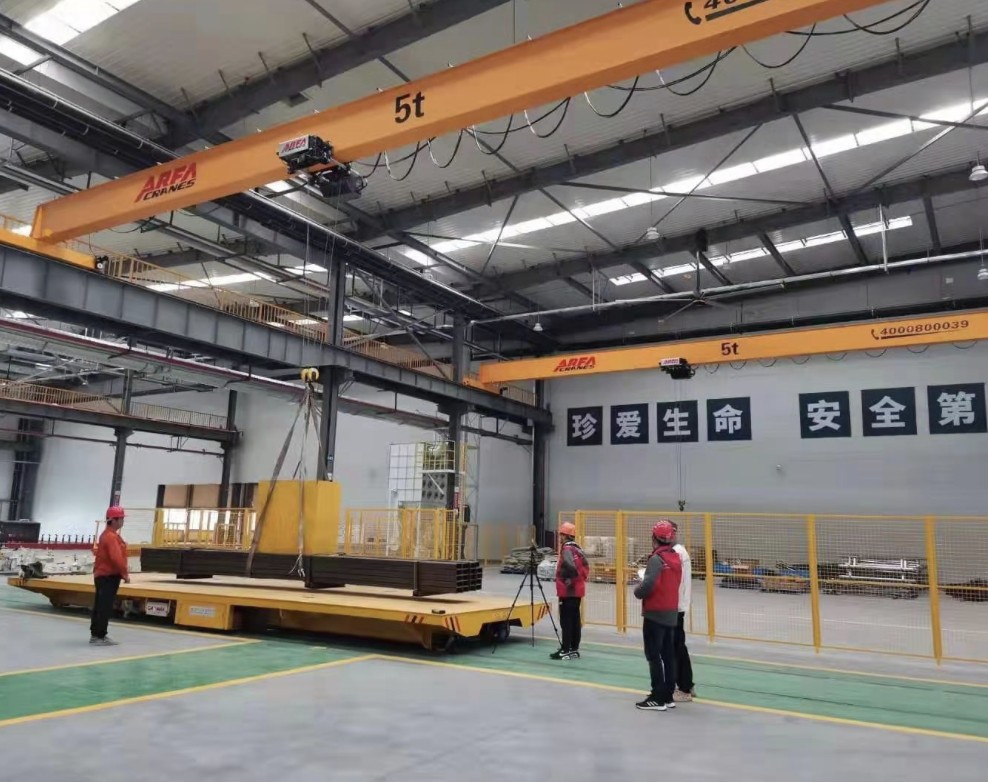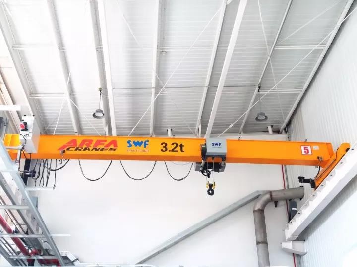 The crane consists of a bridge, electric wire rope hoist, end carriages, and a complete electrical control system with either ground remote control or pendant control. The structure is compact and logically arranged, offering ease of maintenance.