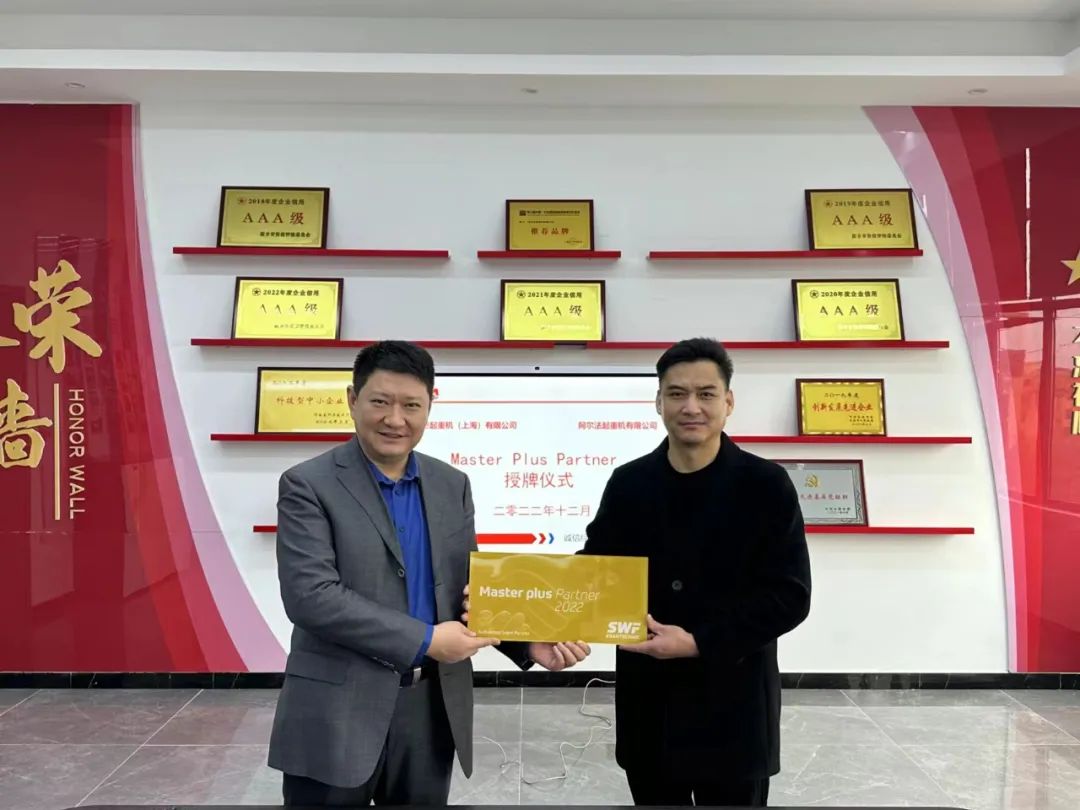 Master Plus Partner的授牌,是德国SWF授予全球范围内最顶级合作伙伴的荣誉,是对阿尔法公司的肯定和信任,也为阿尔法公司继续深耕细分市场,全面提升企业形象,注入了新动力,阿尔法公司将以此为荣,奋楫笃行,励志成为欧式起重机的领先者。