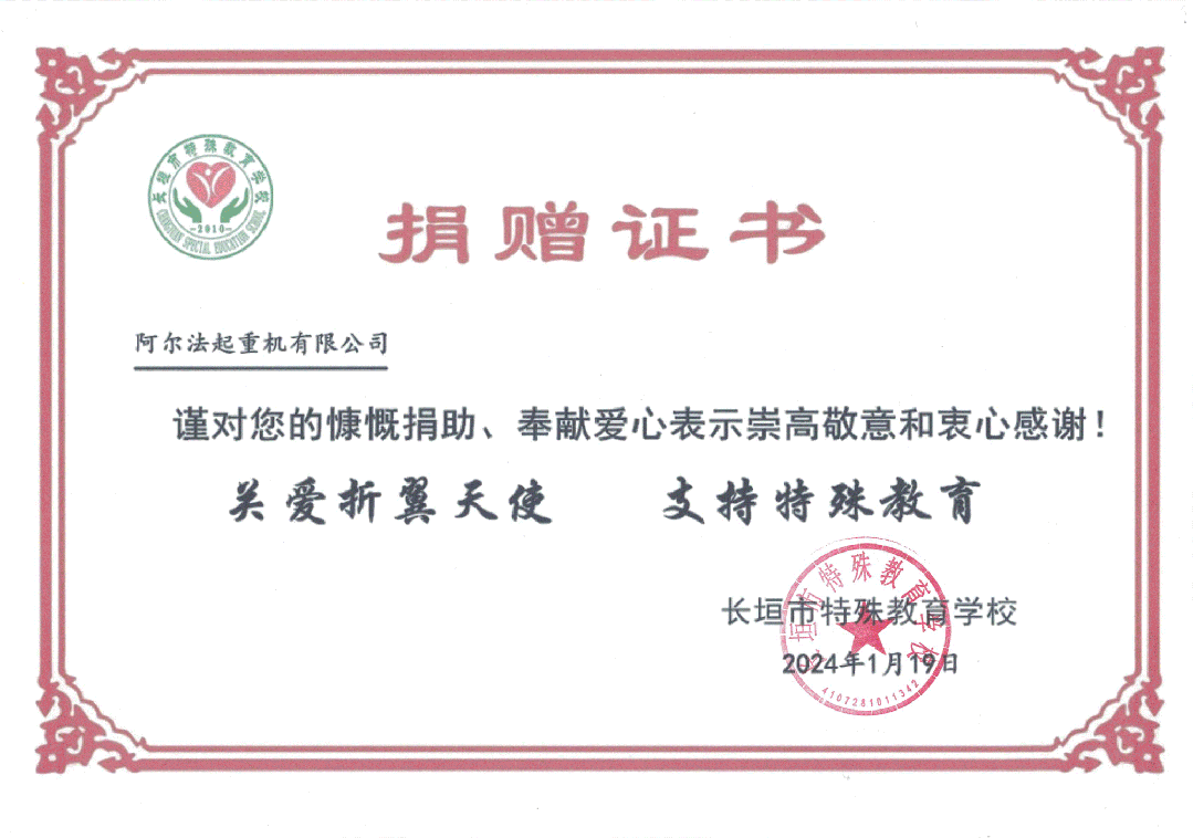 阿尔法起重机有限公司将继续发展企业,创造财富,践行社会责任,力所能及开展社会捐献捐助活动,建设更加和谐美好的社会。