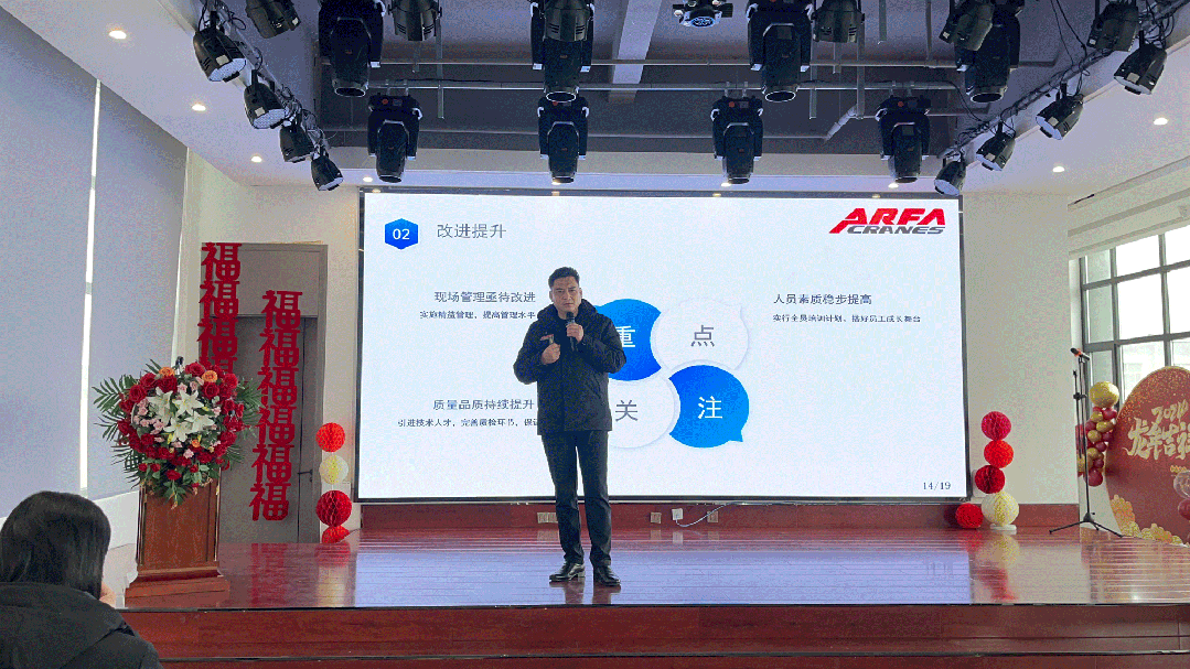 2024年2月1日14时整,阿尔法起重机有限公司2023年工作总结暨表彰大会在四楼会议室隆重召开。公司董事长乔炳真、总经理助理张利镯及各部门负责人、管理人员和一线员工出席本次表彰大会。