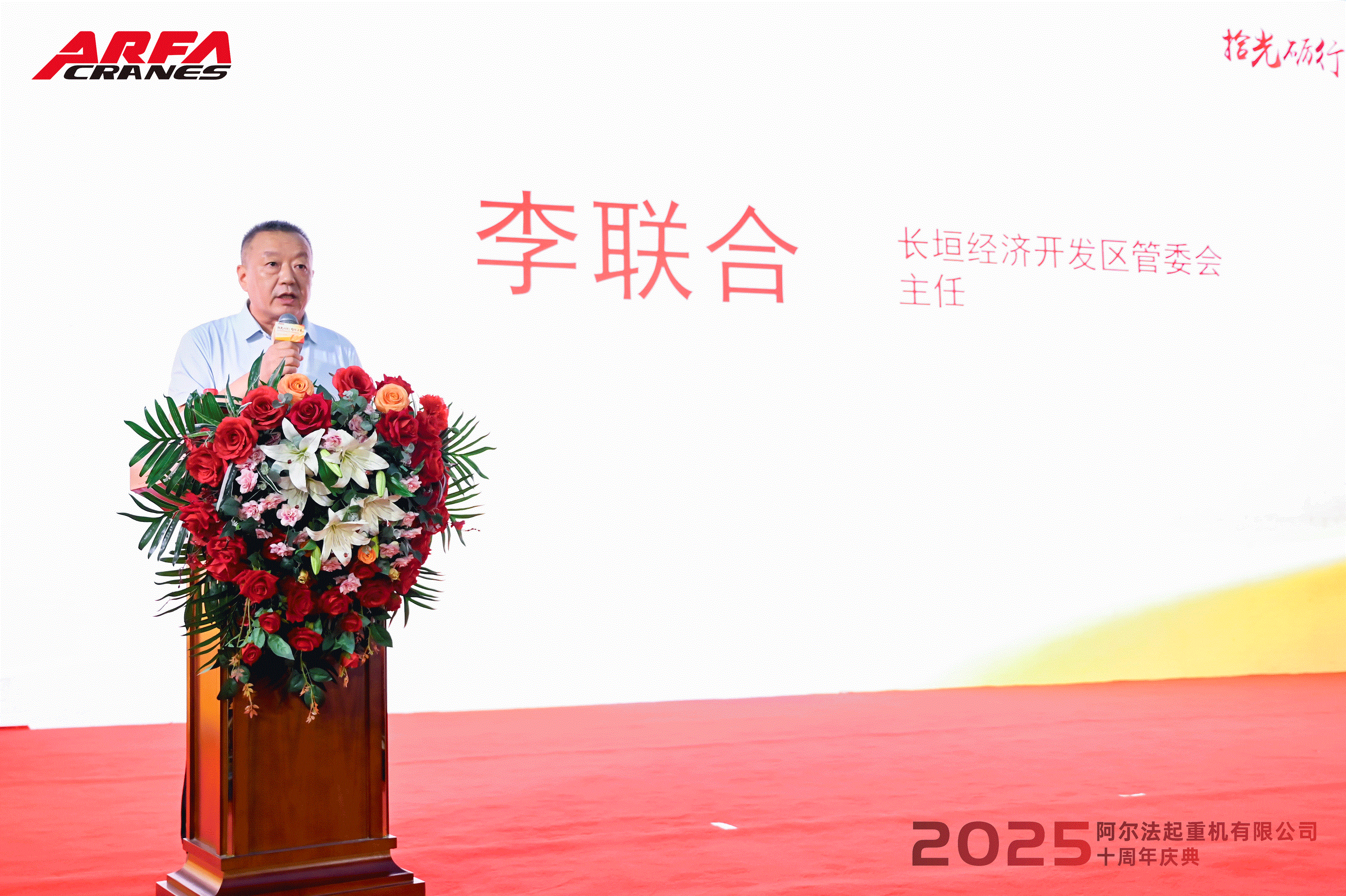阿尔法起重机有限公司董事长乔炳真先生随后登台,深情回顾公司十年创业历程,从起步时的艰难探索,到如今的行业立足,每一步都离不开团队的坚守与伙伴的支持,感恩各方,并坚定表示将坚守初心,带领阿尔法迈向更高质量的发展新阶段。